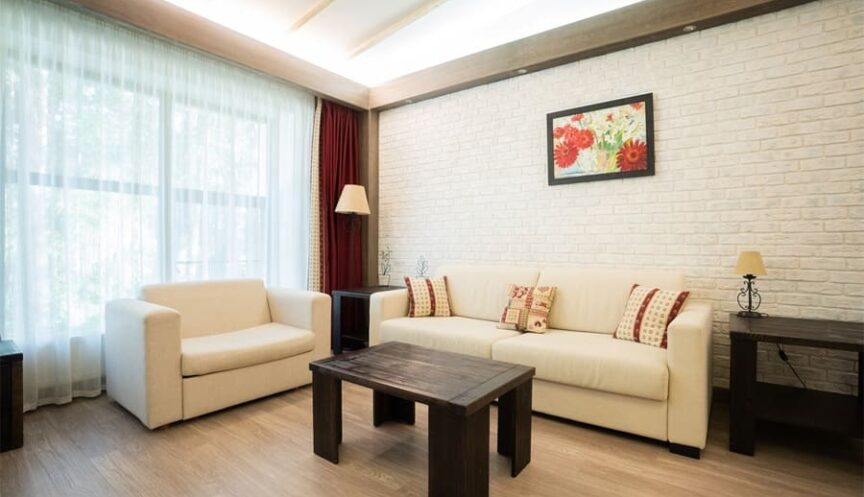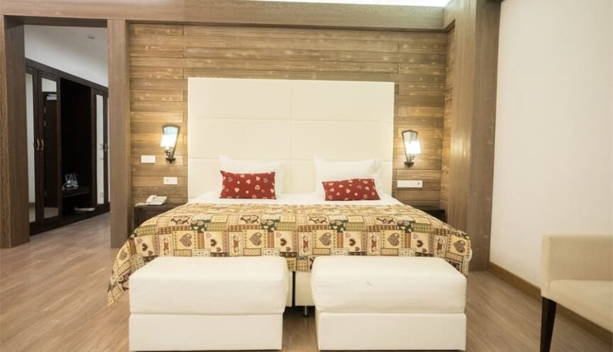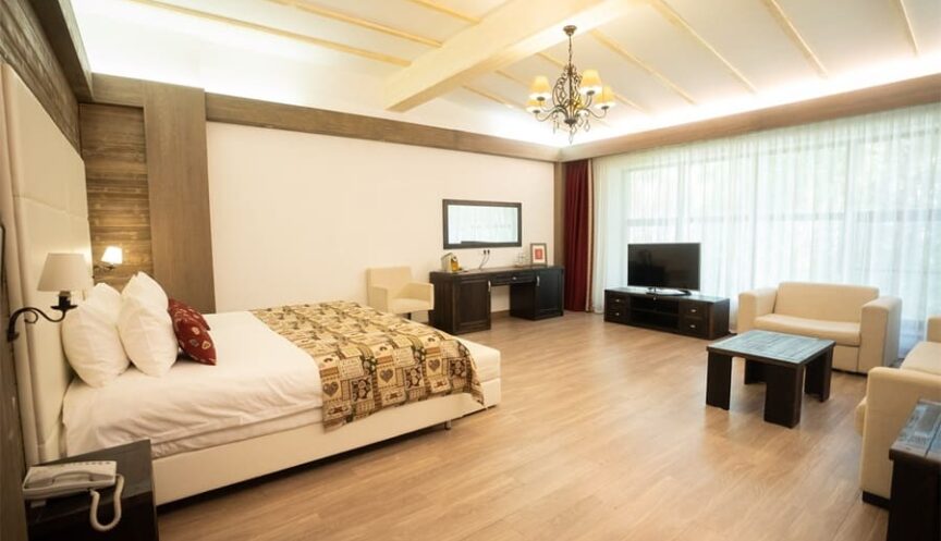 Номер «Джуниор Сюит» в спа-отеле — это однокомнатный номер с видом на лес. В номере есть дополнительное место, где можно разместить гостя, например, на диване. В номере имеется мебель, включая вешалку, диван, зеркало, двуспальную кровать, прикроватные тумбочки, стол, стулья и шкаф. Среди оборудования в номере — кондиционер, сейф, телевизор, телефон и чайная станция.